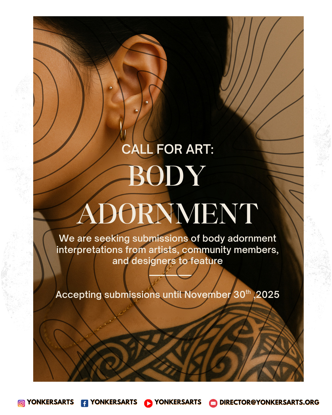 Yonkers Arts is thrilled to announce our next exhibition, “Body Adornment”, an exhibition which will explore the universal human practice of decorating the body using various methods, including clothing, jewelry, makeup, tattoos, piercings, and other forms of body modification.