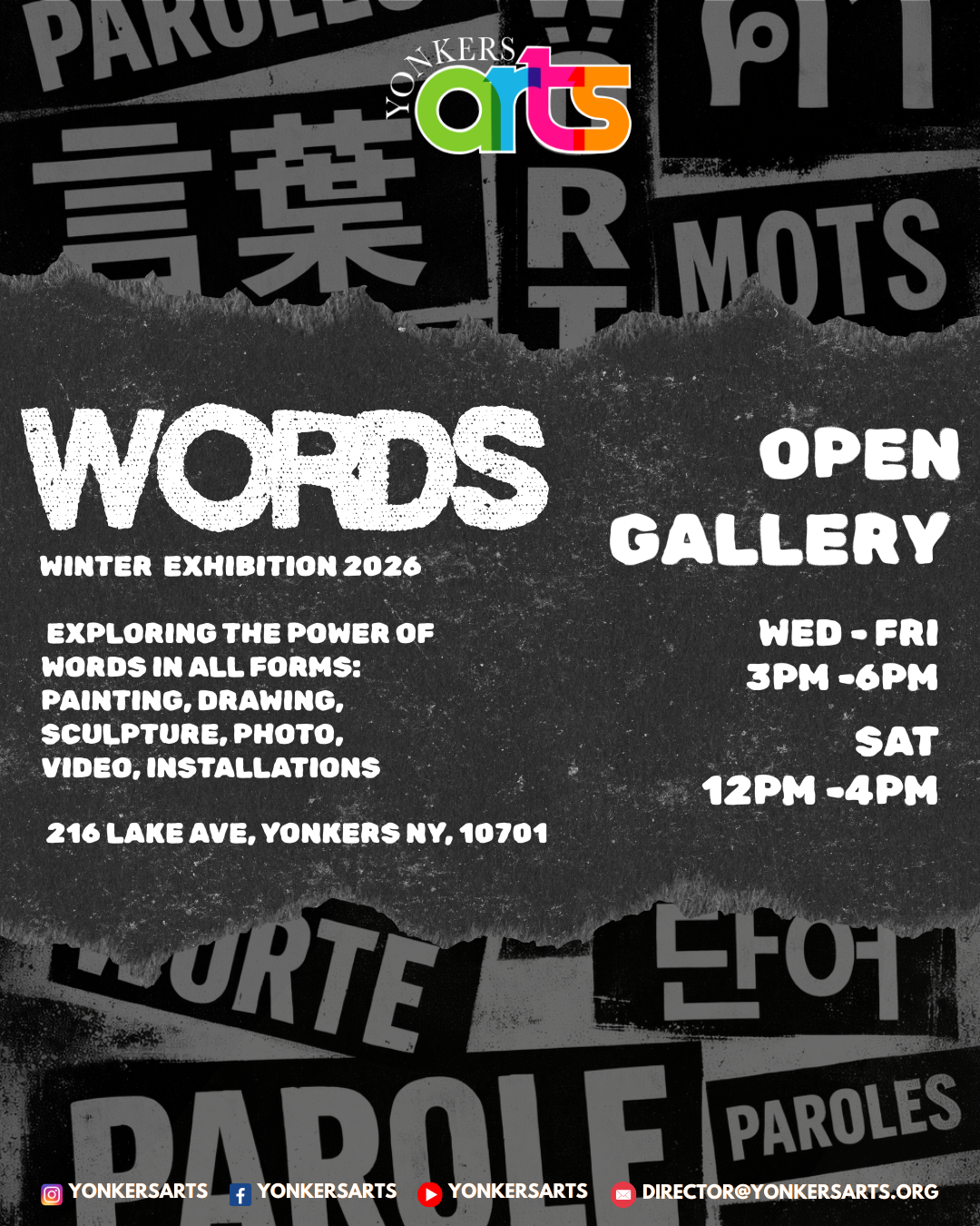 Yonkers Arts is pleased to present WORDS, a multi-disciplinary exhibition featuring the works of 65 artists. Words shape our lives connecting us to each other and convey our needs, desires, feelings, and wishes. 'WORDS' exhibition features artist interpretations of words in traditional or non-traditional media forms of paintings, drawings, sculpture, photography, video, performance, and installation.